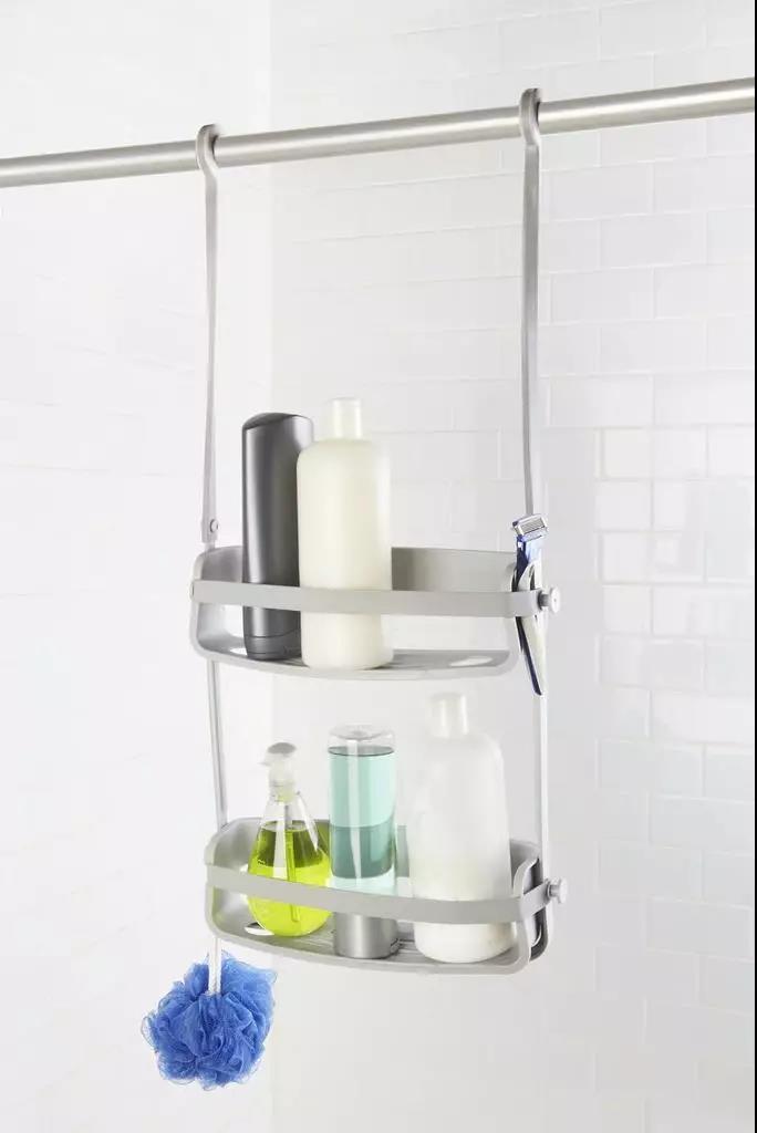 10-借助浴室的桿子或是花灑懸掛置物籃,增加浴室用品的儲物空間