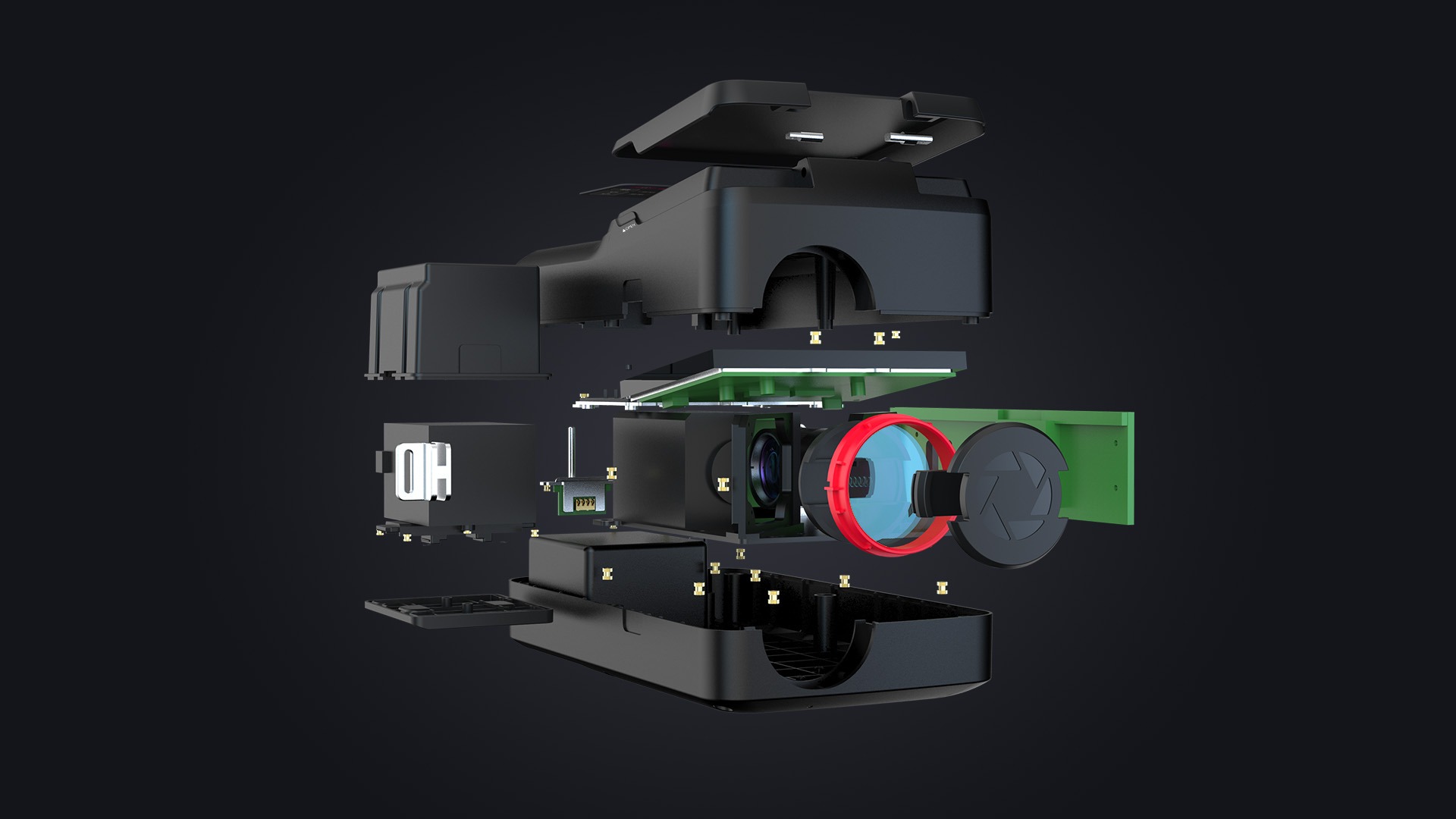 針對前系列產(chǎn)品的造型和結(jié)構(gòu)的優(yōu)化改進。摒棄傳統(tǒng)硅膠套的鏡頭蓋,替換為單反相機的鏡頭蓋。紅圈作為裝飾件提亮整體產(chǎn)品效果。對電池倉進行整合設計,使其取出更為便捷。